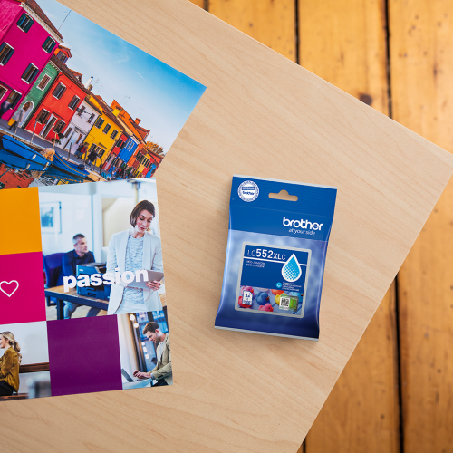 Originální azurová inkoustová kazeta Brother LC552XLC s vysokou výtěžností je vhodná pro častý barevný tisk doma i v kanceláři. Nabízí výtěžnost až 1 500 stran dle normy ISO/IEC 24711.